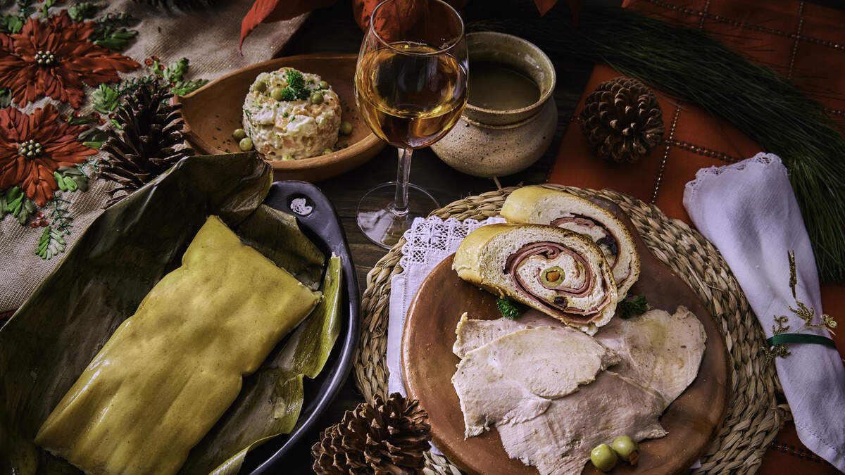 Venezuelan traditional Christmas food: Hallacas, Jamon Bread, Pernil de Cochino and Gallina Salad